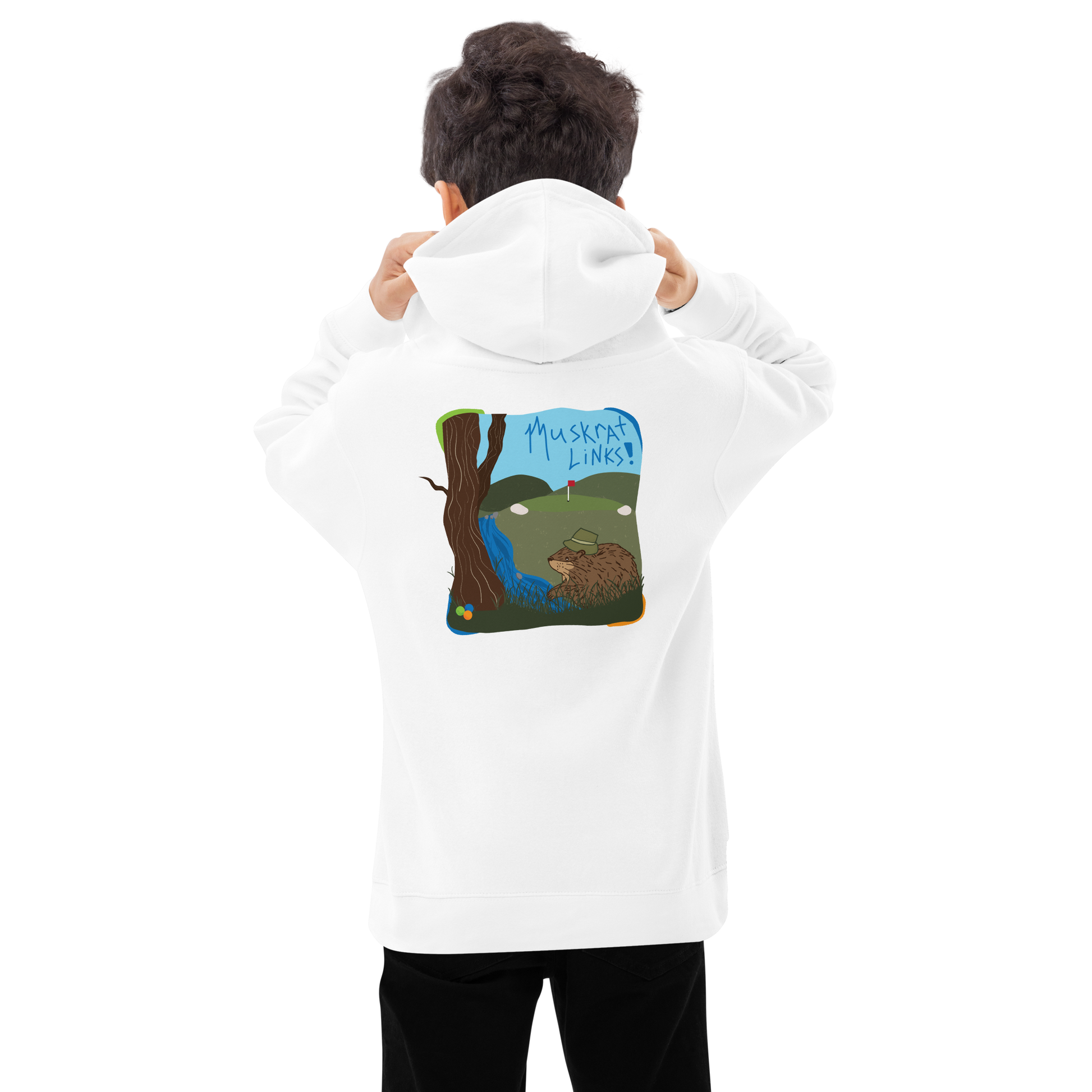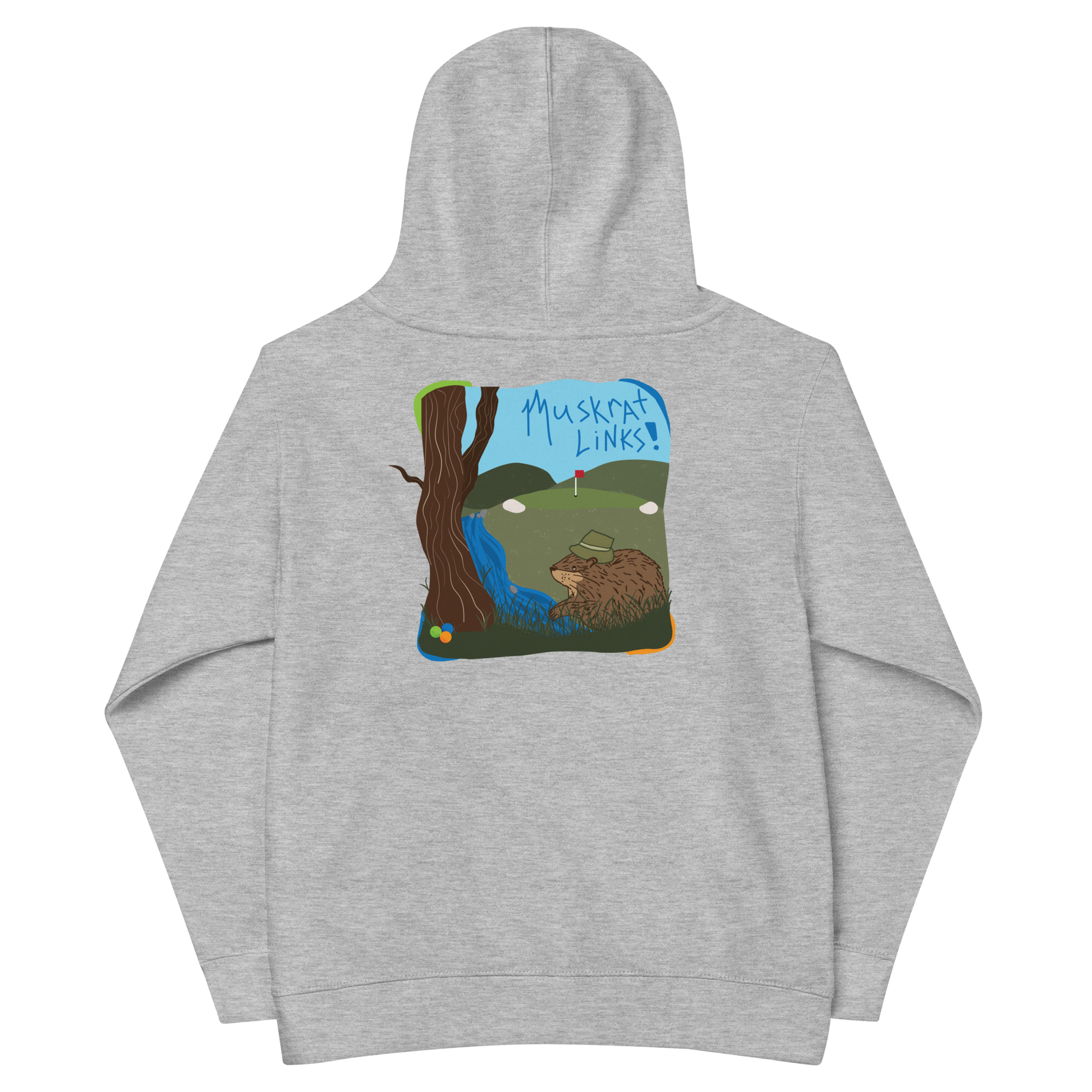 This comfy and durable hoodie will keep up with even the most active kids! Capable of handling all adventures, this hoodie features Sarah's blue "Muskrat Links" custom text design on the front and her incredible golf ball hunting scene on the back - this double sided print is a one of a kind masterpiece that celebrates everyone's favorite channel activity! An absolute must-have!