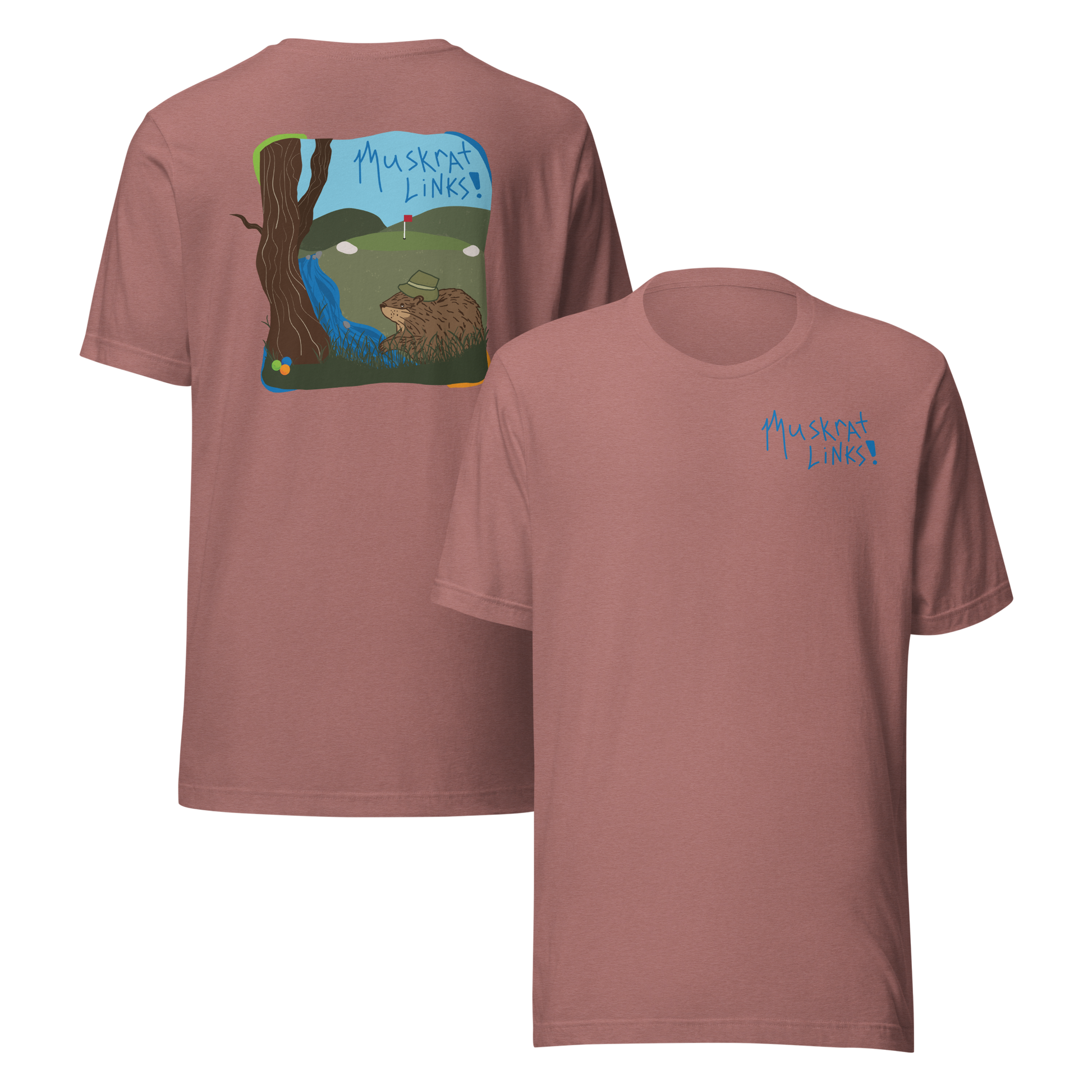 This T-Shirt feels soft and light with just the right amount of stretch. It's comfortable and flattering for all both on and off the course! Featuring Sarah's blue "Muskrat Links" custom text design on the front and her incredible golf ball hunting scene on the back - this T-Shirt is a one of a kind masterpiece that celebrates everyone's favorite channel activity! An absolute must-have!